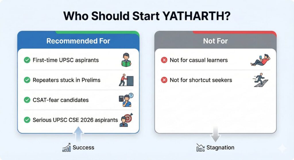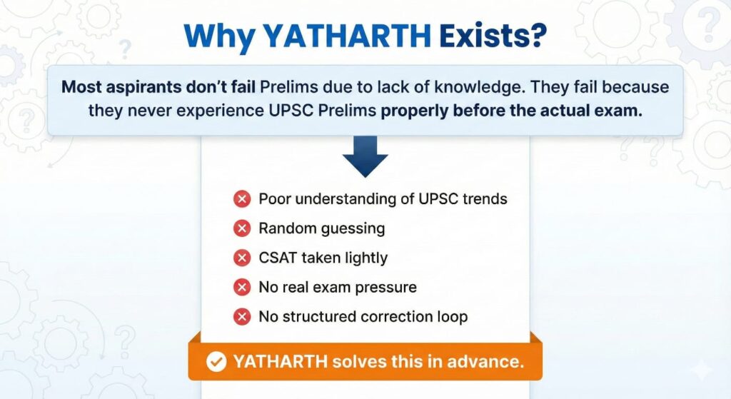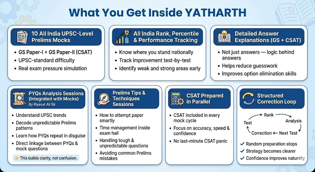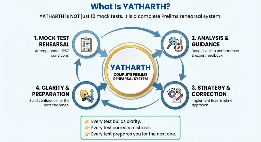 YATHARTH helps you test, analyze, correct, and perform under pressure — which is what clears Prelims.